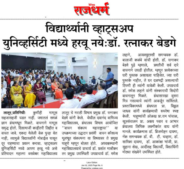 ग्रंथालय विभागामार्फत आयोजितBest Book Review व Best Book Reader Competition 2025–26 या स्पर्धांसाठी ग्रंथावरील अभिप्राय (Book Review / Reader )📅 जमा करण्याची अंतिम तारीख : 28 फेब्रुवारी 2026 आहे.सर्व संबंधित विद्यार्थ्यांनी आपले अभिप्राय विहित मुदतीत ग्रंथालयात जमा करावेत.